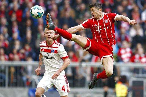 BERLIN (AP) - Robert Lewandowski scored a hat trick and missed a penalty as Bayern Munich enjoyed another rout of Hamburger SV, winning 6-0 on Saturday to move closer to its latest Bundesliga title.