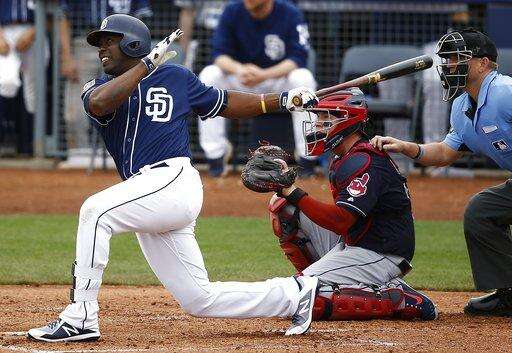 San Diego Padres' Jose Pirela follows through on a home run as Cleveland Indians catcher Roberto Perez, middle and umpire Mike Muchlinski, right, watch the flight of the ball during the second inning of a spring training baseball game Saturday, March 10, 2018, in Peoria, Ariz. (AP Photo/Ross D. Franklin) The Associated Press