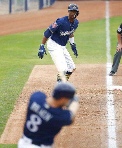 Milwaukee Brewers' Keon Broxton, top, leads off third as teammate Ryan Braun hits against the Colorado Rockies during the second inning of a spring training baseball game Saturday, March 10, 2018, in Phoenix. (AP Photo/Matt York) The Associated Press