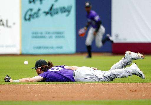 Colorado Rockies' Brendan Rodgers misses a play on a base hit by Milwaukee Brewers' Lorenzo Cain during the first inning of a spring training baseball game Saturday, March 10, 2018, in Phoenix. (AP Photo/Matt York) The Associated Press