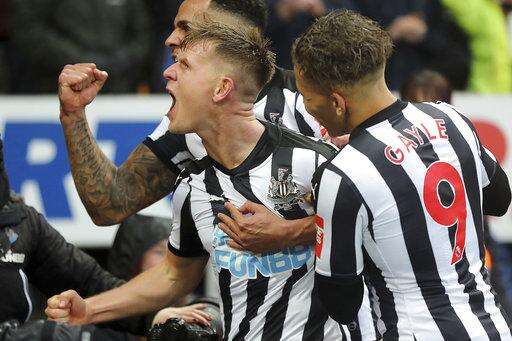 Newcastle United's Matt Ritchie, centre, celebrates scoring his side's third goal of the game against Southampton during their English Premier League soccer match at St James' Park in Newcastle, Saturday March 10, 2018. (Owen Humphreys/PA via AP)