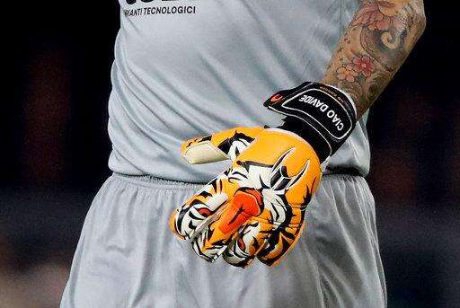Chievo goalkeeper Stefano Sorrentino sports a glove reading "Ciao Davide" (Bye Davide) during the Serie A soccer match between Hellas Verona and Chievo Verona at the Bentegodi stadium in Verona, Italy, Saturday, March 10, 2018. The 31-year-old Fiorentina captain Davide Astori was found dead in his hotel room last Sunday after a suspected cardiac arrest. (Simone Venezia/ANSA via AP) The Associated Press