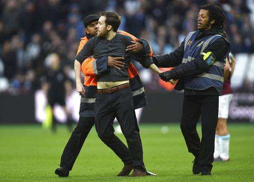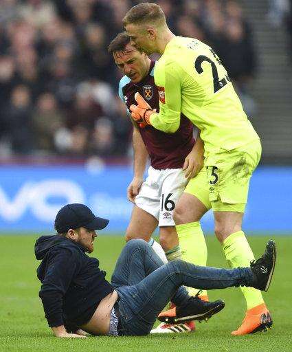 LONDON (AP) - West Ham captain Mark Noble grappled a pitch invader to the ground and the struggling English Premier League club's owners were forced to flee their seats to escape protests during a loss to Burnley on Saturday.