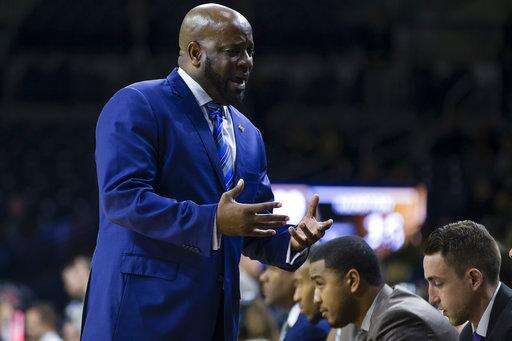 Hampton head coach Edward Joyner Jr. talks to his players against Notre Dame during an NCAA college basketball game in the first round of the NIT tournament, Tuesday, March 13, 2018, in South Bend, Ind. (Michael Caterina/South Bend Tribune via AP)