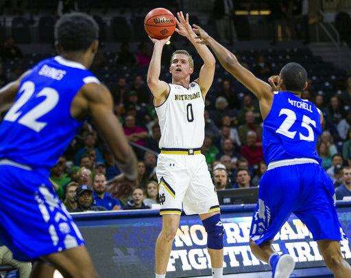Notre Dame's Temple "T.J."Gibbs Jr. (10) shoots against Hampton during an NCAA college basketball game in the first round of the NIT tournament, Tuesday, March 13, 2018, in South Bend, Ind. (Michael Caterina/South Bend Tribune via AP)