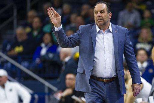 Notre Dame head coach Mike Brey calls out a play against Hampton during an NCAA college basketball game in the first round of the NIT tournament, Tuesday, March 13, 2018, in South Bend, Ind. (Michael Caterina/South Bend Tribune via AP)