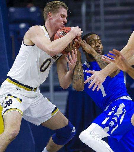 Notre Dame's Rex Pflueger (0) and Hampton's Malique Trent-Street (1) fight for a loose ball during an NCAA college basketball game in the first round of the NIT tournament, Tuesday, March 13, 2018, in South Bend, Ind. (Michael Caterina/South Bend Tribune via AP)