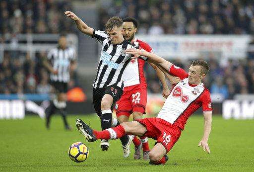 Newcastle United's Matt Ritchie, left, clashes with Southampton's James Ward-Prowse during their English Premier League soccer match at St James' Park in Newcastle, Saturday March 10, 2018. (Owen Humphreys/PA via AP) The Associated Press