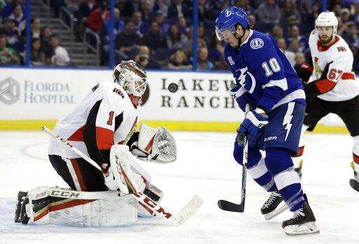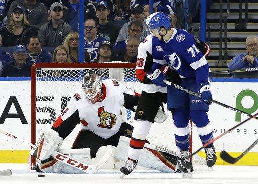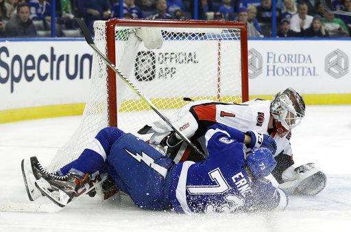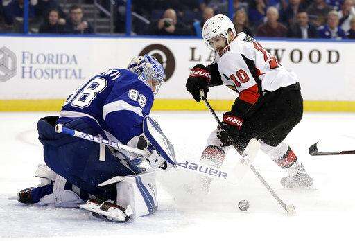 NOTES: Tampa Bay activated G Peter Budaj off injured reserve. Budaj saw his first action since Dec. 27, entering in relief of Andrei Vasilevskiy for the third period. ... Lightning G Louis Domingue was reassigned to the Syracuse Crunch of the American Hockey League. ... Ottawa RW Alex Burrows appeared in his 900th NHL game. ... Senators D Erik Burgdoerfer got his first NHL point. ... Tampa Bay D Victor Hedman got his 100th career power-play point. ... Kucherov became the fifth player in franchise history to reach 90 points in a season, joining Vincent Lecavalier, Martin St. Louis, Stamkos and Brad Richards.