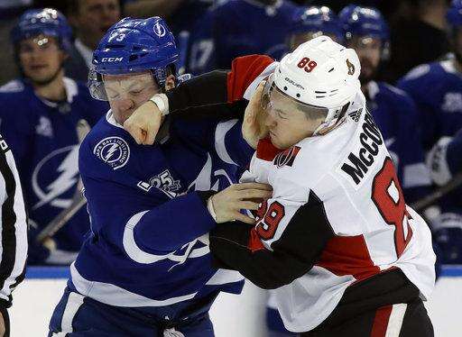 Ottawa Senators left wing Max McCormick (89) connects with a punch as he fights Tampa Bay Lightning left wing Adam Erne (73) during the first period of an NHL hockey game Tuesday, March 13, 2018, in Tampa, Fla. (AP Photo/Chris O'Meara) The Associated Press