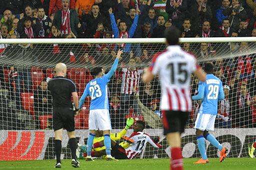 Bilbao's Inaki Williams, center, lies on the pitch as he scores his side opening goal during their Europa League round of 16, 2nd leg, match between Athletic Bilbao and Olympique Marseille, at San Mames stadium, in Bilbao, northern Spain, Thursday, March 15, 2018. (AP Photo/Alvaro Barrientos)