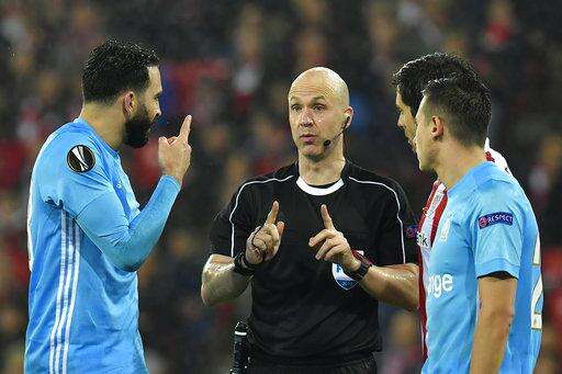 Marseille's Adil Rami, left, argues with British referee Anthony Taylor during their Europa League round of 16, 2nd leg, match between Athletic Bilbao and Olympique Marseille, at San Mames stadium, in Bilbao, northern Spain, Thursday, March 15, 2018. (AP Photo/Alvaro Barrientos)