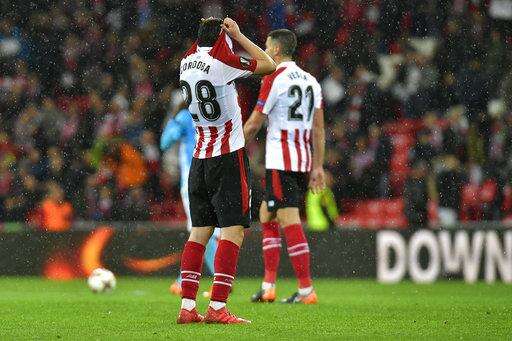 Bilbao's Inigo Cordoba, left, and Mikel Vesga react after their Europa League round of 16, 2nd leg, match between Athletic Bilbao and Olympique Marseille, at San Mames stadium, in Bilbao, northern Spain, Thursday, March 15, 2018. Marseille won 2-1.(AP Photo/Alvaro Barrientos)