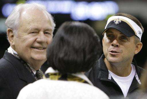 File-This Aug. 30, 2007, file photo shows New Orleans Saints owner Tom Benson left, and his wife Gayle Benson talking with coach Sean Payton before their pre-season football game in New Orleans. Benson, a successful auto dealer who brought the New Orleans Saints their only winning seasons and the "Benson Boogie," has died. Benson, who has also owned the NBA’s New Orleans Pelicans since 2012, was 90. The NFL and NBA teams announced Benson’s death on Thursday, March 15, 2018. (AP Photo/Alex Brandon) The Associated Press