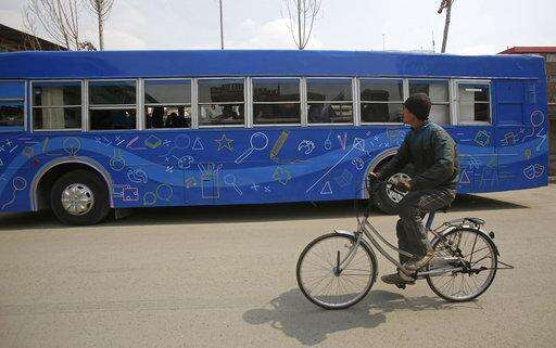 In this Saturday, March 10, 2018 photo, a bus library is parked on a street in Kabul, Afghanistan. From sunrise to sunset, the bus drives around Kabul’s neighborhoods, stopping in each place for a couple of hours at a time. The mobile library was the initiative of 25-year-old Freshta Karim who wanted to give Kabul’s children something badly missing in her own childhood -- the chance to widen one’s horizons, free of the shadow of war and poverty. (AP Photo/Rahmat Gul) The Associated Press