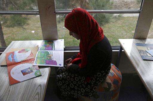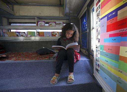 In this Saturday, March 10, 2018, photo, Qaderia, 10, reads a book inside a bus library in Kabul, Afghanistan. From sunrise to sunset, the bus drives around Kabul’s neighborhoods, stopping in each place for a couple of hours at a time. The mobile library was the initiative of 25-year-old Freshta Karim who wanted to give Kabul’s children something badly missing in her own childhood -- the chance to widen one’s horizons, free of the shadow of war and poverty. (AP Photo/Rahmat Gul) The Associated Press