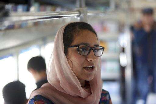 In this Saturday, March 10, 2018 photo, Freshta Karim, 25, owner of a bus library speaks during an interview with The Associated Press inside the bus, in Kabul, Afghanistan. From sunrise to sunset, the bus drives around Kabul’s neighborhoods, stopping in each place for a couple of hours at a time. Karim wanted to give Kabul’s children something badly missing in her own childhood -- the chance to widen one’s horizons, free of the shadow of war and poverty. (AP Photo/Rahmat Gul) The Associated Press