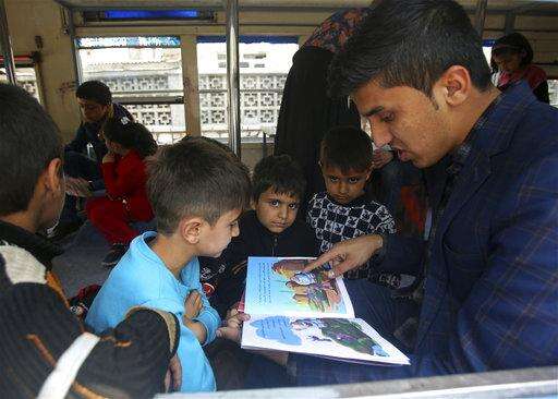 In this Saturday, March 10, 2018 photo, Siyam Barakati, 21, reads a story for children inside a bus library, in Kabul, Afghanistan. From sunrise to sunset, the bus drives around Kabul’s neighborhoods, stopping in each place for a couple of hours at a time. The mobile library was the initiative of 25-year-old Freshta Karim who wanted to give Kabul’s children something badly missing in her own childhood -- the chance to widen one’s horizons, free of the shadow of war and poverty. (AP Photo/Rahmat Gul) The Associated Press