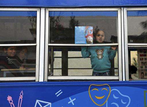 In this Saturday, March 10, 2018 photo, children look out the window of a bus library, in Kabul, Afghanistan. From sunrise to sunset, the bus drives around Kabul’s neighborhoods, stopping in each place for a couple of hours at a time. The mobile library was the initiative of 25-year-old Freshta Karim who wanted to give Kabul’s children something badly missing in her own childhood -- the chance to widen one’s horizons, free of the shadow of war and poverty. (AP Photo/Rahmat Gul) The Associated Press