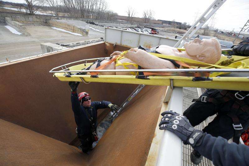 Schaumburg firefighter Dave Sager lifts out a victim Friday as Wheeling Fire Department hosts a simulated disaster training exercise at the former Orange Crush asphalt in Wheeling.