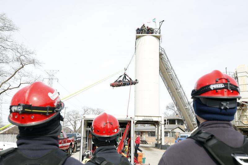The drill included a simulation of an explosion of the asphalt facility with six to eight employees unaccounted for. Team members needed to use rope skills in a confined space and deal with the need for heavy lifting and concrete cutting during the training exercise.