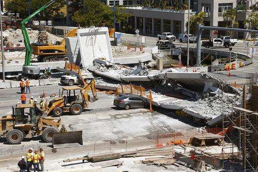 Workers stand in front of crushed cars under a section of a collapsed pedestrian bridge, Friday, March 16, 2018 near Florida International University in the Miami area. The new pedestrian bridge that was under construction collapsed onto a busy Miami highway Thursday afternoon, crushing vehicles beneath massive slabs of concrete and steel, killing and injuring several people, authorities said. (AP Photo/Wilfredo Lee) The Associated Press