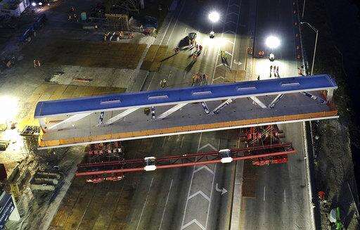 This March 10, 2018 photo shows an early morning view of the main span of the a pedestrian bridge that is being positioned to connect the City of Sweetwater, Fla., to Florida International University near Miami. The 950- ton new bridge collapsed Thursday, March 15, over several cars causing several fatalities and injuries. (Pedro Portal/ The Miami Herald via AP) The Associated Press