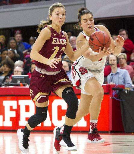 North Carolina State's Aislinn Konig, right, knocks the ball away from Elon's Lexi Mercer (22) during the first half of a first-round game in the NCAA women's college basketball tournament in Raleigh, N.C., Friday, March 16, 2018. (AP Photo/Ben McKeown) The Associated Press