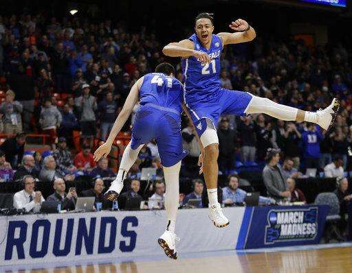 Buffalo's Dominic Johnson, right, and Brock Bertram celebrate after Buffalo upset Arizona 89-68 in first-round game in the NCAA men's college basketball tournament Thursday, March 15, 2018, in Boise, Idaho. (AP Photo/Ted S. Warren) The Associated Press