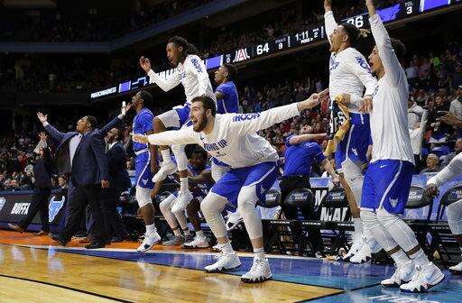 Buffalo guard Dontay Caruthers (22) celebrates on the bench after Buffalo upset Arizona 89-68 in a first-round game in the NCAA men's college basketball tournament Thursday, March 15, 2018, in Boise, Idaho. (AP Photo/Ted S. Warren) The Associated Press