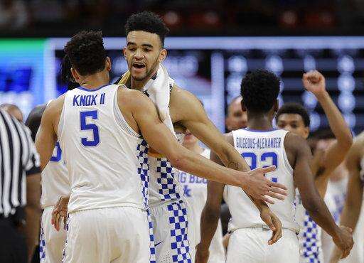 Kentucky's Kevin Knox (5) greets teammate Sacha Killeya-Jones, second from left, during a timeout in the second half of a first-round game against Davidson in the NCAA men's college basketball tournament Thursday, March 15, 2018, in Boise, Idaho. Kentucky won 78-73. (AP Photo/Ted S. Warren) The Associated Press