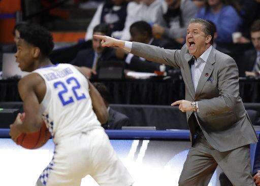 Kentucky coach John Calipari, right, calls to his team as guard Shai Gilgeous-Alexander (22) heads downcourt during the first half of a first-round game against Davidson in the NCAA men's college basketball tournament Thursday, March 15, 2018, in Boise, Idaho. (AP Photo/Ted S. Warren) The Associated Press