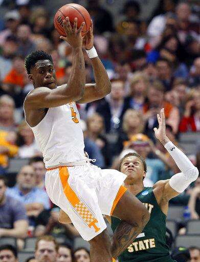 Tennessee forward Admiral Schofield (5) looks to make a pass as Wright State forward Everett Winchester (2) defends in the second half of a first-round game of the NCAA college basketball tournament in Dallas, Thursday, March 15, 2018. (AP Photo/Tony Gutierrez) The Associated Press