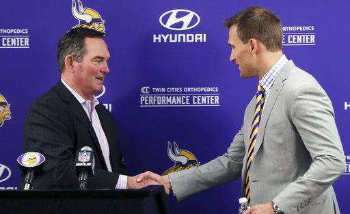 Minnesota Vikings new quarterback Kirk Cousins, right, is welcomed to the podium by head coach Mike Zimmer before addressing the media at a news conference after he was introduced after signing a three-year, $84 million contract at the NFL football team's new headquarters Thursday, March 15, 2018, in Eagan, Minn. (AP Photo/Jim Mone) The Associated Press