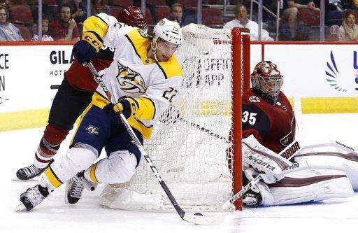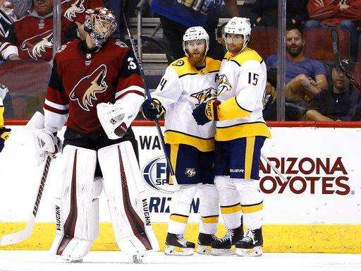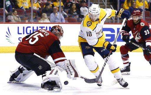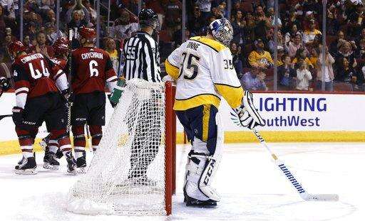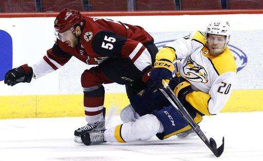 NOTES: Tocchet was asked before the game how he is holding up after his mother's passing. He said watching the Coyotes beat the Los Angeles Kings in the overtime shootout Tuesday helped him cope for a time. "My mom had a good run. So, big hockey fan," he said. "It was tough, but temporary relief there when I was watching the team play against L.A. and how well they played. It was a nice feeling with the family." ... No. 1 goalie Antti Raanta (lower-body injury) isn't quite ready to return but is getting closer, as is C Zac Rinaldo from injury, Tocchet said. ... Predators C Calle Jarnkrok will miss the rest of the season with an upper-body injury suffered in Tuesday's win over Winnipeg, the team announced on its website. Jarnkrok had 35 points in 68 games. ... C Ryan Johansen skated in his 500th career game. ... A cheer rose from the crowd when the final score of the Arizona-Buffalo NCAA tournament game was announced. The greater Phoenix area is home to Arizona rival Arizona State University.