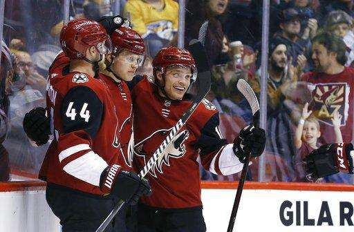 Arizona Coyotes center Christian Dvorak, middle, celebrates his goal against the Nashville Predators with defenseman Kevin Connauton (44) and left wing Max Domi, right, during the second period of an NHL hockey game Thursday, March 15, 2018, in Glendale, Ariz. (AP Photo/Ross D. Franklin) The Associated Press
