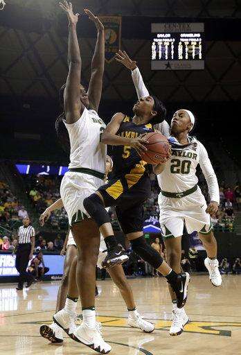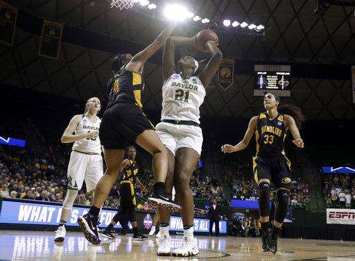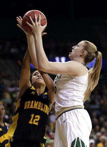 Baylor center Kalani Brown (21) and Juicy Landrum (20) defend against a shot by Grambling State guard Shakyla Hill (5) in the first half of a first-round game at the NCAA women's college basketball tournament in Waco, Texas, Friday, March 16, 2018. (AP Photo/Tony Gutierrez) The Associated Press
