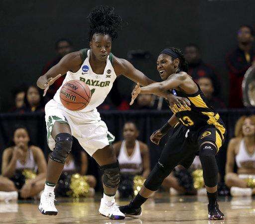 Baylor forward Dekeiya Cohen (1) gets past Grambling State guard Monisha Neal (4) on a drive to the basket in the second half of a first-round game at the NCAA women's college basketball tournament in Waco, Texas, Friday, March 16, 2018. (AP Photo/Tony Gutierrez) The Associated Press