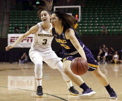 Michigan guard Katelynn Flaherty (3) defends as Northern Colorado guard Tiarna Clarke (0) works to the basket in the second half of a first-round game at the NCAA women's college basketball tournament in Waco, Texas, Friday, March 16, 2018. (AP Photo/Tony Gutierrez) The Associated Press