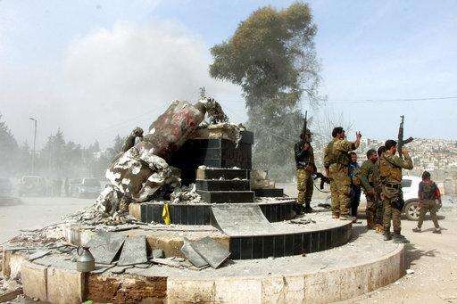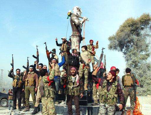 Another Dogan video showed a Syrian fighter shooting at a statue symbolizing the Kurdish new year celebrations that are also being held this week, before a bulldozer attempts to pull it down. The statue is of Kawa, a mythological figure revered by the Kurds who defeated a brutal ruler in Iran's Zagros mountains and lit fires to spread the news, ushering in spring.