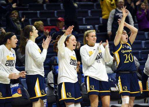 Quinnipiac players celebrates at the buzzer of a first-round game against Miami in the NCAA women's college basketball tournament in Storrs, Conn. Saturday, March 17, 2018. Quinnipiac won, 86-72. (AP Photo/Stephen Dunn) The Associated Press