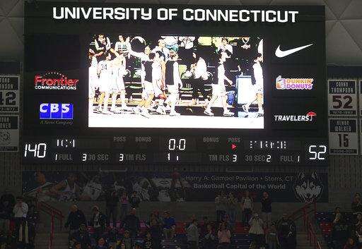 The scoreboard at the University of Connecticut is displays the final score of a first-round game between UConn and St. Francis (Pa.) in the NCAA women's college basketball tournament in in Storrs, Conn., Saturday, March 17, 2018, (AP Photo/Jessica Hill) The Associated Press
