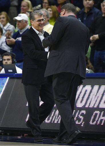 Connecticut head coach Geno Auriemma shakes hands with Saint Francis (Pa.) head coach Joe Haigh, right, at the end of a first-round game in the NCAA women's college basketball tournament in in Storrs, Conn., Saturday, March 17, 2018. UConn won 140-52. (AP Photo/Jessica Hill) The Associated Press