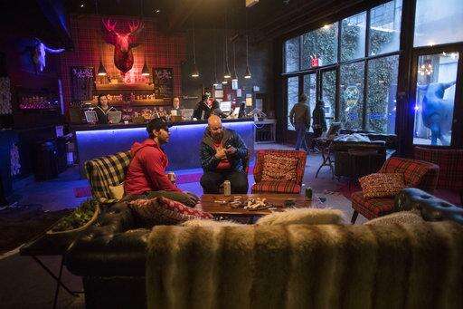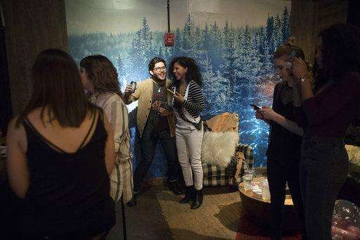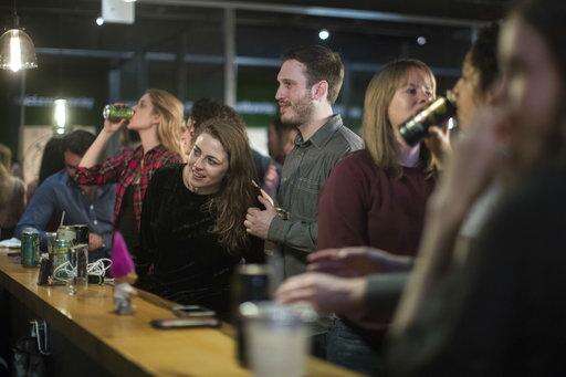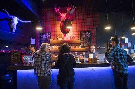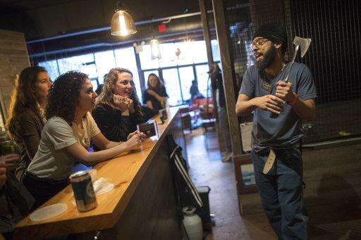 In this Saturday, March 3, 2018, photo, contestants purchase items at the bar at the Kick Axe Throwing venue in the Brooklyn borough of New York. Kick Axe Throwing is the first bar in New York City to pick up on a nationwide trend of ax throwing. (AP Photo/Mary Altaffer)