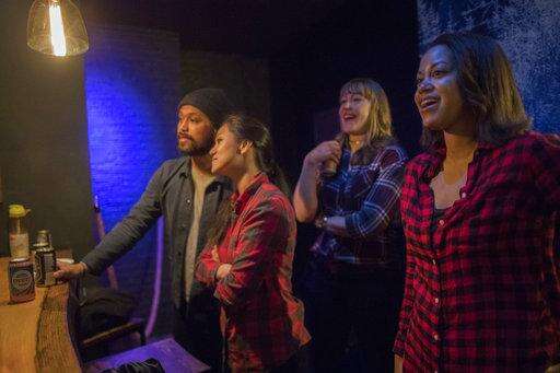 In this Saturday, March 3, 2018, photo, an Ax-pert, right, gives customers instruction on hatchet throwing techniques and the rules of the game at the Kick Axe Throwing venue in the Brooklyn borough of New York. Kick Axe Throwing is the first bar in New York City to pick up on a nationwide trend of ax throwing. (AP Photo/Mary Altaffer)