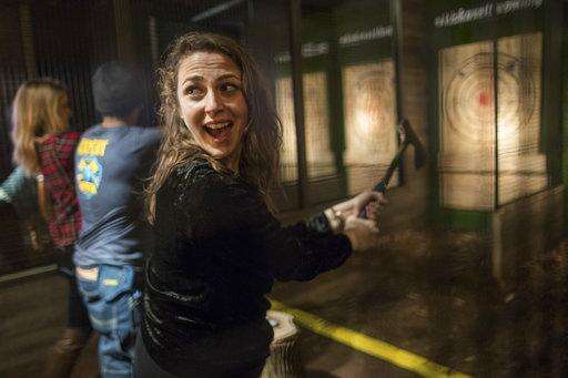 In this March 3, 2018, photo, an "axepert," center, gives contestants instruction on hatchet throwing techniques and the rules of the game at the Kick Axe Throwing venue in the Brooklyn borough of New York. Kick Axe Throwing is the first bar in New York City to pick up on a nationwide trend of ax throwing. (AP Photo/Mary Altaffer)