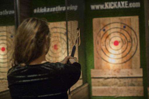 In this Saturday, March 3, 2018, photo, a contestant gets ready to throw a hatchet at a wooden bull's-eye at the Kick Axe Throwing venue in the Brooklyn borough of New York. Ax throwing is a growing sport that some enthusiasts hope will take off the way bowling did in the last century. (AP Photo/Mary Altaffer)
