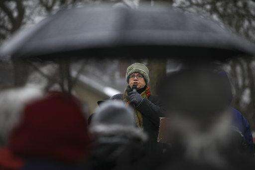 In this Tuesday, March 20, 2018, photo, Fulton resident Katherine Hamberg speaks at the rally in Minneapolis, near where Justine Damond was shot last July. A Minneapolis police officer was charged Tuesday with murder and manslaughter in the fatal shooting of Damond, an unarmed Australian woman, minutes after she called 911 to report a possible sexual assault behind her home. (Jeff Wheeler/Star Tribune via AP) The Associated Press