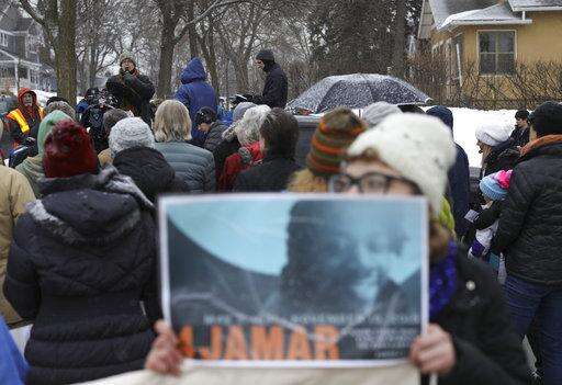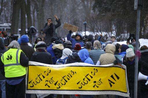 In this Tuesday, March 20, 2018, photo, Leslie Badue, President of the NAACP Minneapolis Chapter, speaks to the crowd gathered for the rally in Minneapolis, near where Justine Damond was shot last July. A Minneapolis police officer was charged Tuesday with murder and manslaughter in the fatal shooting of Damond, an unarmed Australian woman, minutes after she called 911 to report a possible sexual assault behind her home. (Jeff Wheeler/Star Tribune via AP) The Associated Press
