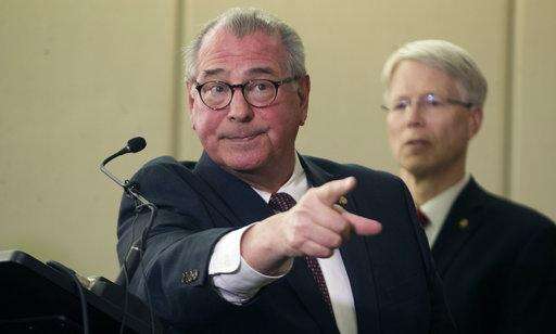 In this Tuesday March 20, 2018, photo, Hennepin County Attorney Mike Freeman describes during a press conference how Minneapolis police officer Mohamed Noor reached across his partner's body and shot Justine Damond at the Hennepin County Government Center in Minneapolis. Noor was charged Tuesday with murder and manslaughter in the fatal shooting of an unarmed Australian woman in July minutes after she called 911 to report a possible sexual assault behind her home. (Jerry Holt/Star Tribune via AP) The Associated Press